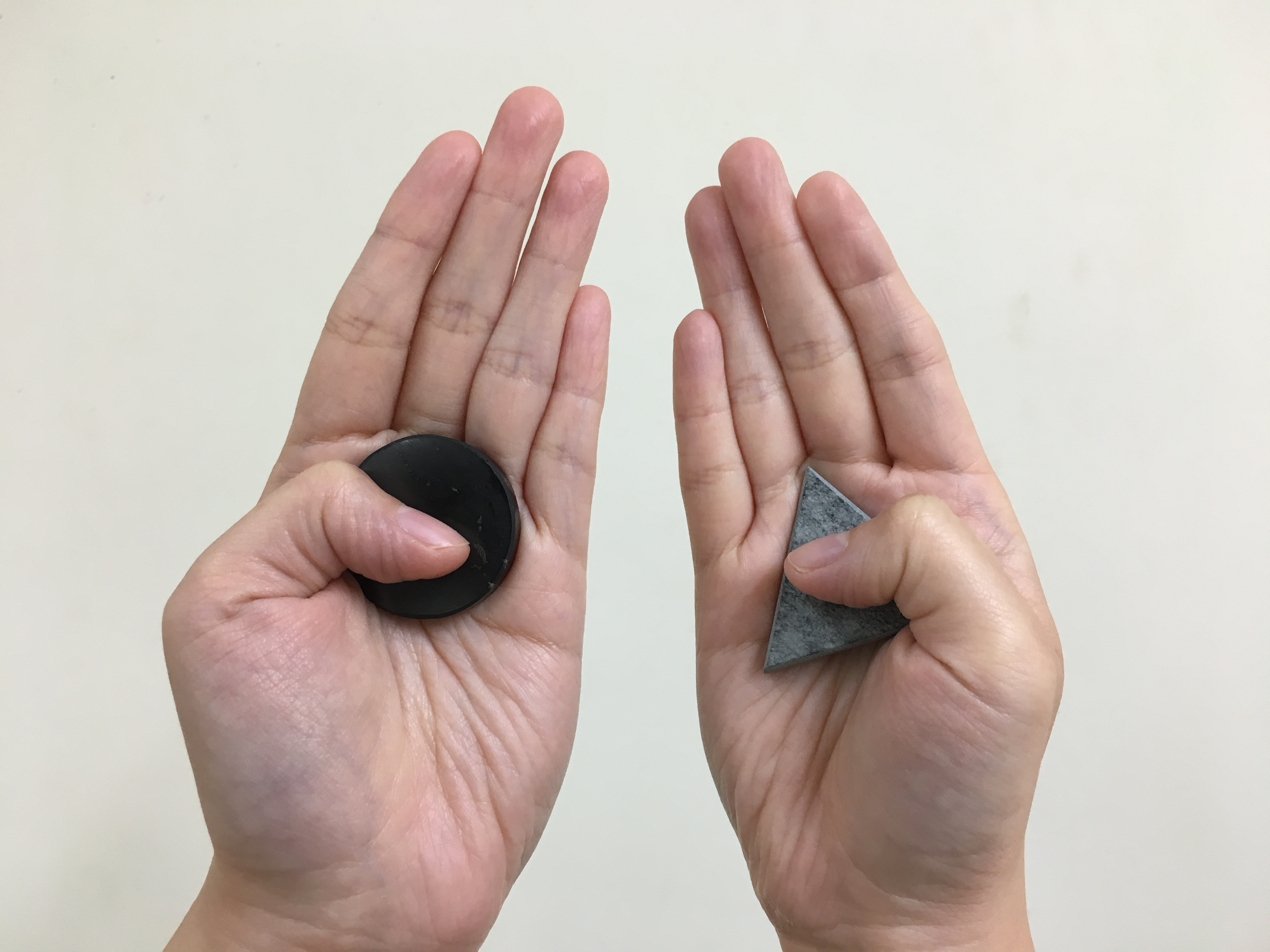 1.(如圖)使用者左手握住圓型次石墨平衡器(黑色), 右手握住三角型滑石平衡器(灰色),輕輕握拳,舒服地坐著,雙腿不交叉,雙手放在膝蓋上,使它們保持平行,專注於觀想身體不和諧的的能量離開身體 。(每天可使用多次)